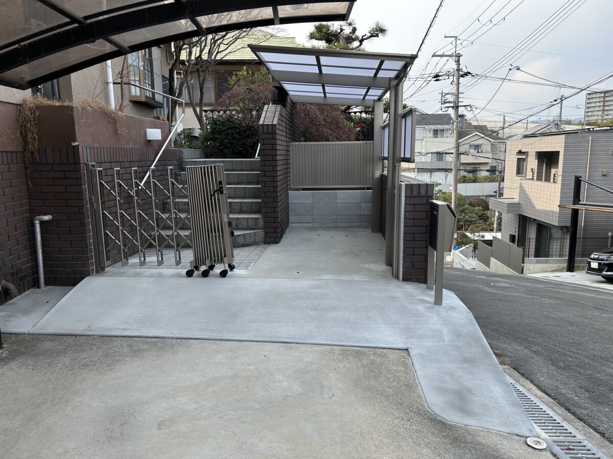 今回は箕面市での外構工事のご紹介です 傷んだガレージ(駐車スペース)の補修工事です ガレージの車道側が割れてしまいボ…